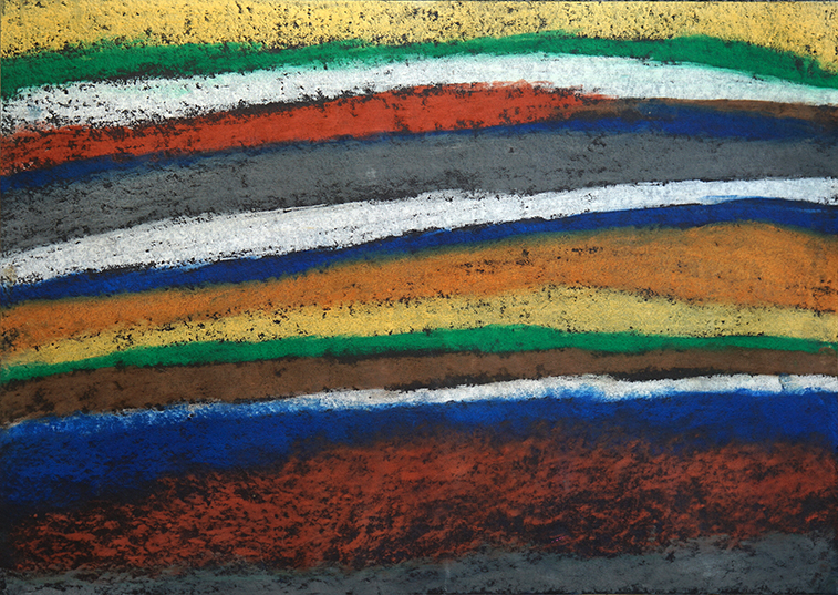 She creates vibrant abstract colour fields, often with thick pastel and acrylics.